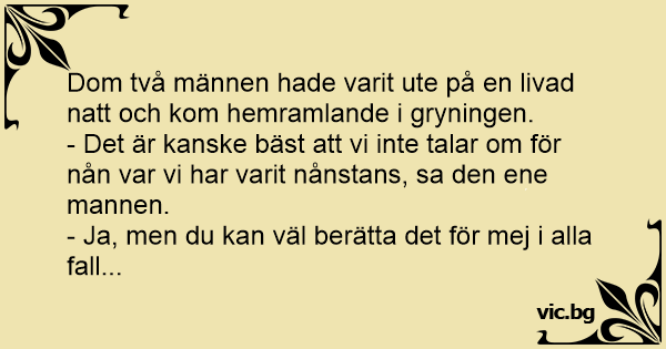 - Det är kanske bäst att vi inte talar om för nån var vi har varit nånstans, sa den ene mannen.