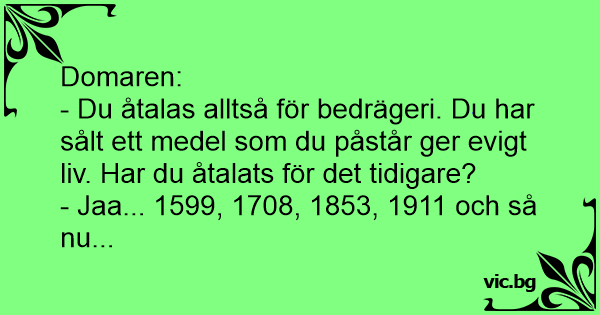 Domarn tittar strängt på den anklagade och säger: - Ni är åtalad för att ha sålt piller som garanterar evigt liv. Har ni blivit straffad tidigare? - Ja, herr domare, 4 gånger! 1792, 1821, 1896 och 1952!