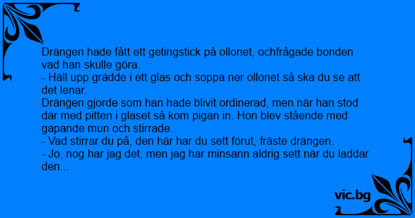 Drängen gjorde som han hade blivit ordinerad, men när han stod där med pitten i glaset så kom pigan in. Hon blev stående med gapande mun och stirrade.