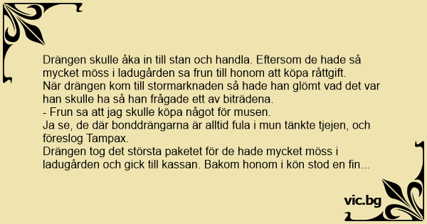 Drängen tog det största paketet för de hade mycket möss i ladugården och gick till kassan. Bakom honom i kön stod en fin dam med minsta förpackningen Tampax i handen.