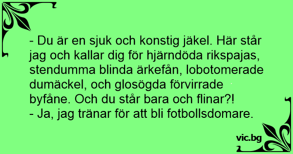 - Du är en sjuk och konstig jäkel. Här står jag och kallar dig för hjärndöda rikspajas, stendumma blinda ärkefån, lobotomerade dumäckel, och glosögda förvirrade byfåne. Och du står bara och flinar?!