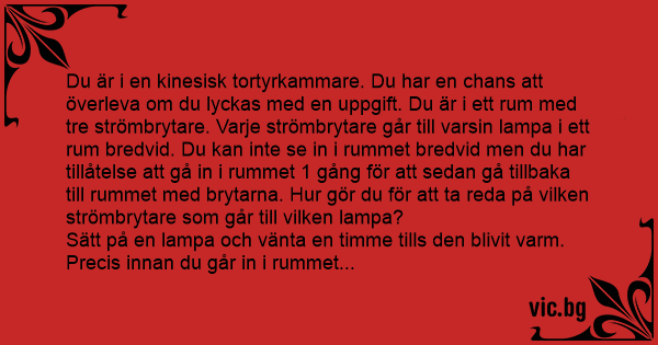 Du är i en kinesisk tortyrkammare. Du har en chans att överleva om du lyckas med en uppgift. Du är i ett ruм med tre strömbrytare. Varje strömbrytare går till varsin lampa i ett ruм bredvid. Du kan inte se in i rummet bredvid men du har tillåtelse att gå in i rummet 1 gång för att sedan gå tillbaka till rummet med brytarna. Hur gör du för att ta reda på vilken strömbrytare som går till vilken lampa?