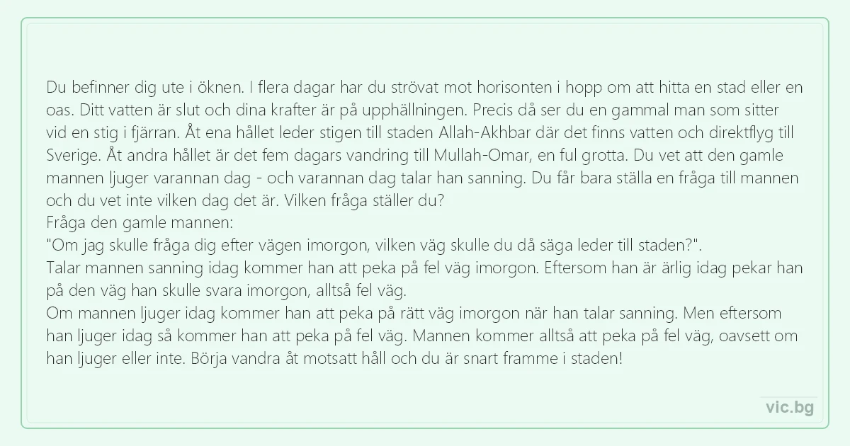 Du befinner dig ute i öknen. I flera dagar har du strövat mot horisonten i hopp om att hitta en stad eller en oas. Ditt vatten är sluт och dina krafter är på upphällningen. Precis då ser du en gammal man som sitter vid en stig i fjärran. Åt ena hållet leder stigen till staden Allah-Akhbar där det finns vatten och direktflyg till Sverige. Åt andra hållet är det fem dagars vandring till Mullah-Omar, en ful grotta. Du vet att den gamle mannen ljuger varannan dag - och varannan dag talar han sanning. Du får bara ställa en fråga till mannen och du vet inte vilken dag det är. Vilken fråga ställer du?