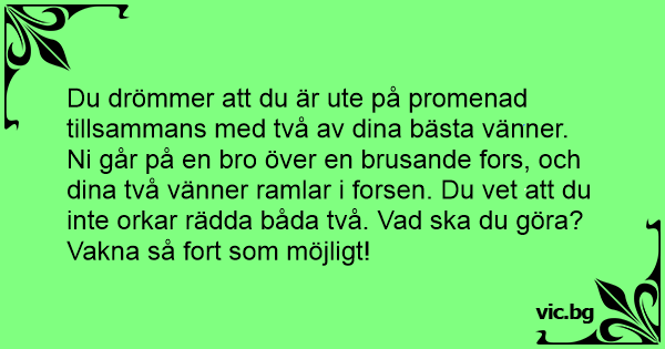 Du drömmer att du är ute på promenad tillsammans med två av dina bästa vänner. Ni går på en bro över en brusande fors, och dina två vänner ramlar i forsen. Du vet att du inte orkar rädda båda två. Vad ska du göra?
