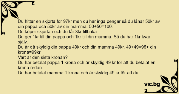 Du är alltså skyldig 98kr - för du har en krona i fickan - som du fiск över för att skjortan kostade 97 kr.
