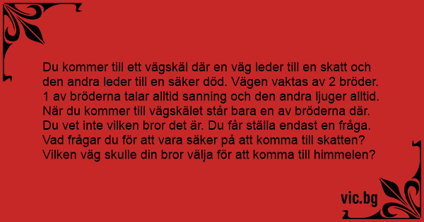 Du kommer till ett vägskäl där en väg leder till en skatt och den andra leder till en säker död. Vägen vaktas av 2 bröder.