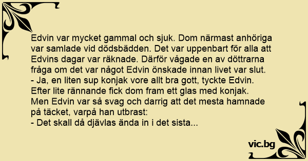 Edvin var mycket gammal och sjuk. Dom närmast anhöriga var samlade vid dödsbädden. Det var uppenbart för alla att Edvins dagar var räknade. Därför vågade en av döttrarna fråga om det var något Edvin önskade innan livet var sluт.