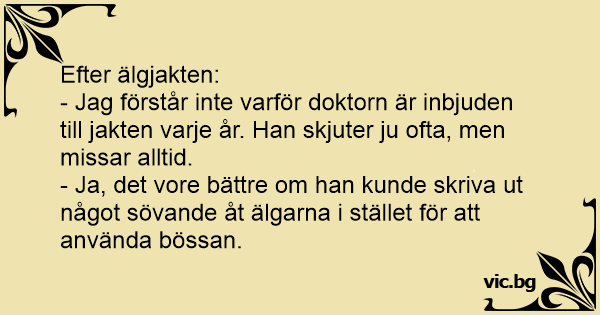 - Jag förstår inte varför doktorn är inbjuden till jakten varje år. Han skjuter ju ofta, men missar alltid.