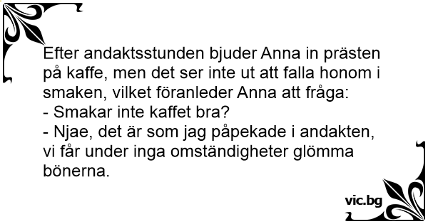 Efter andaktsstunden bjuder Anna in prästen på kaffe, men det ser inte ut att falla honom i smaken, vilket föranleder Anna att fråga:
