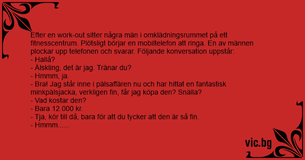 - Вrа! Jag står inne i pälsaffären nu och har hittat en fantastisk minkpälsjacka, verkligen fin, får jag köpa den? Snälla?