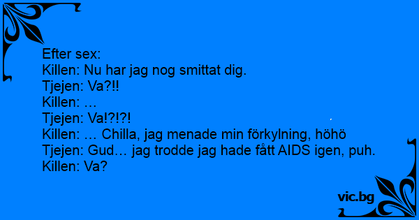 Повторно добивање Чукала се блондинка с някакъв тип. След секса уплашено го пита?: После бурно поминатата ноќ, се буди плавуша со непознат маж во креветот и го прашува: Une blonde fait l'amour avec un garçon. Au bout d'un moment elle lui demande: Младеж с мацка ще правят любов. После непреспана ноќ, плавушата го прашува партнерот: - Извини заборавив вчера да те прашам, да не имаш СИДА случајно? Не, и одговара тој, а што ти текна баш на сега на тоа? - Онака, само што ја прележав , па да не фатам пак! En man har sex med en blondin. När de är klara frågar hon honom om han har HIV. - Nej, svarar han. - Vilken tur, det vill jag verkligen inte ha en till gång. Facet baraszkuje w łóżku z piękna blondynką. Nagle dziewczyna pyta: - Ale nie masz AIDS, co? - Oczywiście, że nie! - Dzięki Bogu! Nie chciałabym znowu tego złapać. O cara era louco pra levar aquela loira gostosona pra cama. E por mais que ele insistisse ela nada. Depois de pedir umas mil vezes, ela aceita, mas impôs uma condição: — Só se você fizer um exame e... Esto es una pareja que se conoce en una fiesta y la misma noche acaban en la cama. Al acabar, va la chica y dice: - Oye, ¿tú no tendrás el SIDA, verdad?. - ¡No!. - Menos mal, ya sería mala suerte...