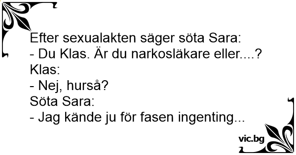 Nākamajā rītā pēc pirmās nakts. Viņa: ?Kāda īsti ir tava profesija?? Viņš: ?Anesteziologs.? Viņa: ?Tagad skaidrs, kāpēc es neko nejutu.?