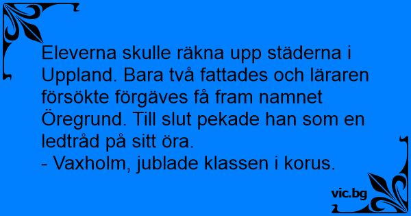 Eleverna skulle räkna upp städerna i Uppland. Bara två fattades och läraren försökte förgäves få fram namnet Öregrund. Till sluт pekade han som en ledtråd på sitt öra.