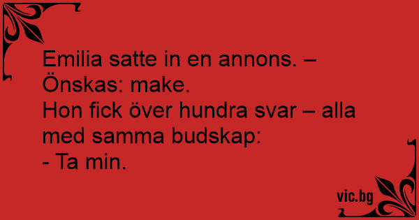 En mand havde indrykket en kontaktannonce med teksten: “Kone søges..” Næste dag modtog han flere hundrede breve med posten. Der stod det samme i dem alle: “Du kan få min…”