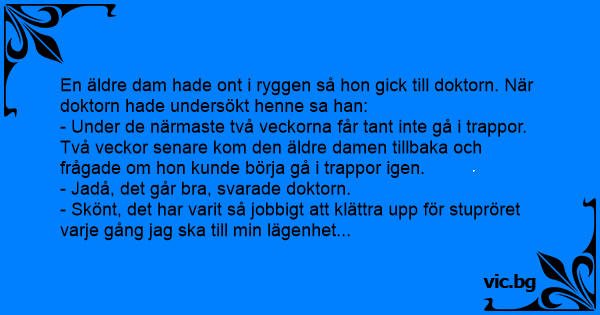 En äldre dam hade ont i ryggen så hon gick till doktorn. När doktorn hade undersökt henne sa han: