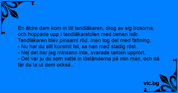 Dentist Μασέλα Бабичка отива на зъболекар. Ляга на стола и си вдига краката. Една баба отива на зъболекар. Сяда на стола и се разкрачва. An old lady went to visit her dentist. When it was her turn, she sat in the chair, lowered her underpants, and raised her legs. The dentist said: “Excuse me, but I’m not a gynecologist.” “I know,” said the old lady. “I want you to take my husband’s teeth out.” Aquela senhora, sempre muito discreta, entra no consultório do dentista, levanta a saia, tira a calcinha e senta-se na cadeira com as pernas escancaradas. Indignado, o dentista consegue balbuciar:... Przychodzi baba do dentysty, siada w fotelu i od razu ciąga majtki. - Ależ droga pani! - protestuje lekarz - Ja jestem dentystą, ginekolog przyjmuje piętro niżej! - Nie ma żadnej pomyłki. -... To takhle přišla do zubní ordinace pěkná ženská, posadila se do křesla, vyhrnula sukni, sundala kalhotky a roznožila. Lékař ji jemně upozornil, že je u zubaře a ne u gynekologa. Načež odvětila:... Una mujer acude al dentista. Cuando llega su turno, se baja la falda, se baja las bragas, y se sienta en la silla, con las piernas abiertas. El dentista al entrar en la sala, se queda sorprendido y... Una donna va da stomatologa, si sdraia sulla sedia come dal ginecologo e il dottore: - "Signora, lei ha sbagliato il gabinetto... Non sono medico ginecologo!!! - "So benissimo dottore! ma solo lei...