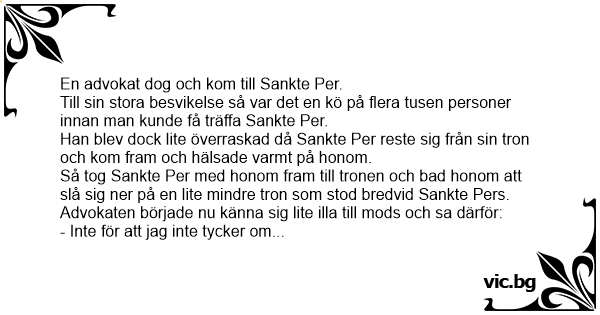En advokat står inför Sankte Per, som säger: - I vanliga fall släpper vi inte in såna som du här, men du har tur, för vi har ett speciellt erbjudande den här veckan. Det innebär att du tvingas...