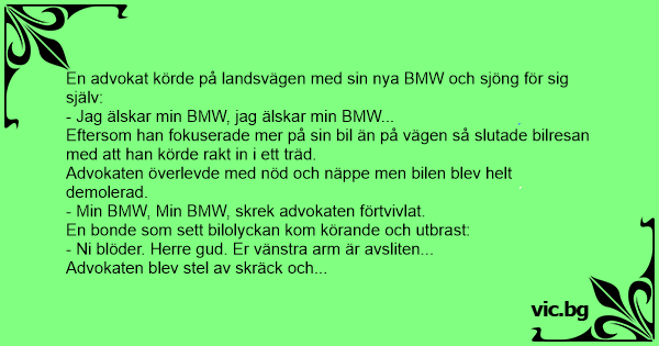 A lawyer opened the door of his BMW, when suddenly a car came along and hit the door, ripping it off completely. When the police arrived at the scene, the lawyer was hopping up and down with rage, complaining bitterly about the damage to his precious...