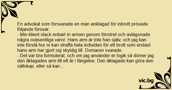 - Min klient stack enbart in armen genom fönstret och avlägsnade några oväsentliga varor. Hans arm är inte han själv, och jag kan inte förstå hur ni kan straffa hela individen för ett brott som endast hans arm har gjort sig skyldig till. Domaren svarade:
