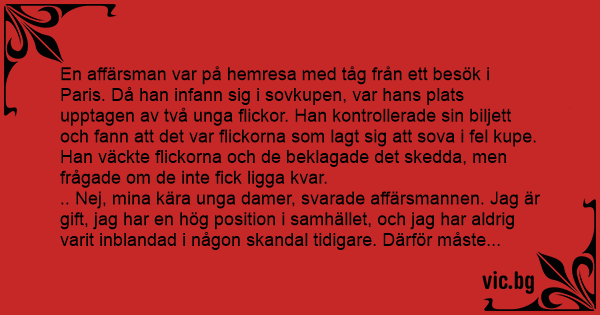 .. Nej, mina kära unga damer, svarade affärsmannen. Jag är gift, jag har en hög position i samhället, och jag har aldrig varit inblandad i någon skandal tidigare. Därför måste jag tyvärr be en av er att lämna kupen.