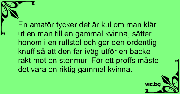 En amatör tycker det är kul om man klär ut en man till en gammal kvinna, sätter honom i en rullstol och ger den ordentlig knuff så att den far iväg utför en backe rakt mot en stenmur. För ett proffs måste det vara en riktig gammal kvinna.