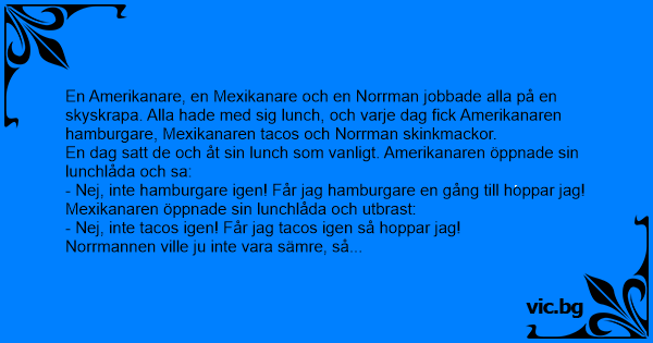 En Amerikanare, en Mexikanare och en Norrman jobbade alla på en skyskrapa. Alla hade med sig lunch, och varje dag fiск Amerikanaren hamburgare, Mexikanaren tacos och Norrman skinkmackor.
