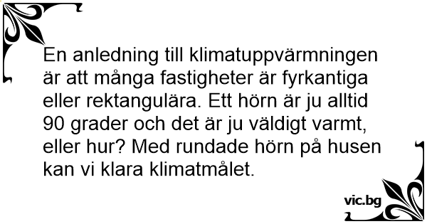 En anledning till klimatuppvärmningen är att många fastigheter är fyrkantiga eller rektangulära. Ett hörn är ju alltid 90 grader och det är ju väldigt varmt, eller hur? Med rundade hörn på husen kan vi klara klimatmålet.