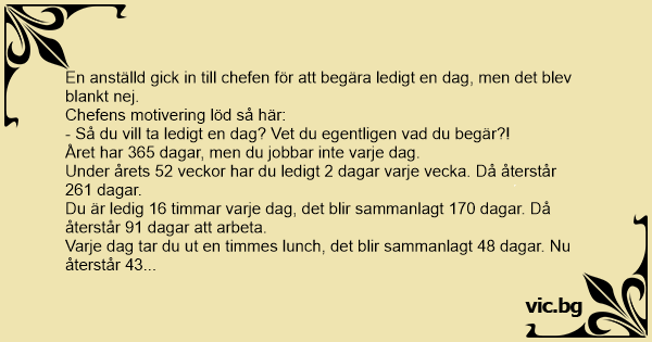 Sen har du en semester på 25 dar. Då återstår bara en enda dag och den förstår du väl att du inte kan ta ledigt!!!