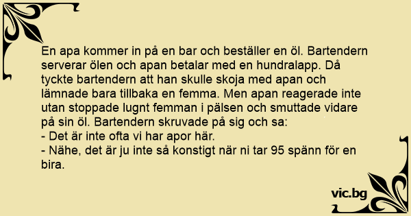 En apa kommer in på en bar och beställer en öl. Bartendern serverar ölen och apan betalar med en hundralapp. Då tyckte bartendern att han skulle skoja med apan och lämnade bara tillbaka en femma. Men apan reagerade inte utan stoppade lugnt femman i pälsen och smuttade vidare på sin öl. Bartendern skruvade på sig och sa:
