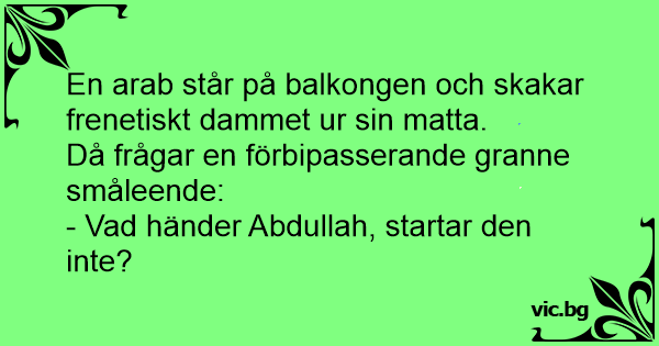 Nen arabier staat op het balkon zijn tapijt uit te kloppen. Komt er nen Vlaamsen buurman langs: Wa ist probleem handdoekdragerke, wilt em ni starten?