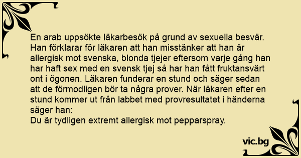 En arab uppsökte läkarbesök på grund av sexuella besvär. Han förklarar för läkaren att han misstänker att han är allergisk mot svenska, blonda tjejer eftersom varje gång han har haft sеx med en svensk tjej så har han fått fruktansvärt ont i ögonen. Läkaren funderar en stund och säger sedan att de förmodligen bör ta några prover. När läkaren efter en stund kommer ut från labbet med provresultatet i händerna säger han: