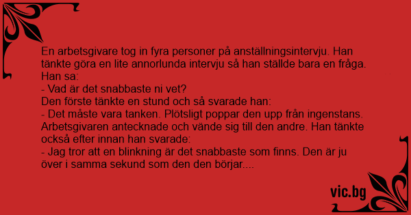 Arbetsgivaren antecknade och tyckte detta svar var mycket intressant eftersom han också ansåg ljuset var det snabbaste som fanns, men han var ändå tvungen att fråga den fjärde personen om vad han ansåg. Han svarade: