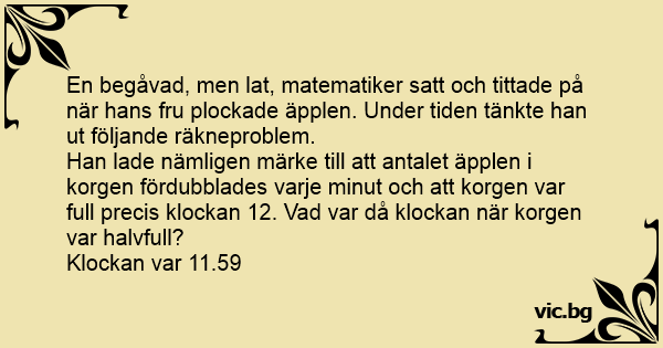 En begåvad, men lat, matematiker satt och tittade på när hans fru plockade äpplen. Under tiden tänkte han ut följande räkneproblem.