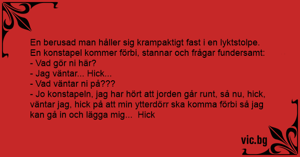 - Jo konstapeln, jag har hört att jorden går runt, så nu, hick, väntar jag, hick på att min ytterdörr ska komma förbi så jag kan gå in och lägga mig... Hick