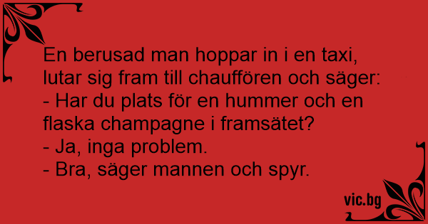 Taxarejse En fuld mand prajer en taxa og åbner døren og spørger chaufføren om han har plads til en kasse øl og 3 røde pølser der skal til København. Chaufføren siger at det er intet problem...