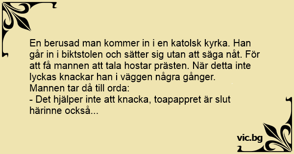 Beül a gyóntatófülkébe egy részeg pasi. Miután már hosszabb ideje nem szól semmit, a pap köhint egyet... Semmi... Megint köhint egyet... Semmi... A pap lassan elveszíti a türelmét és elkezd kopogni...