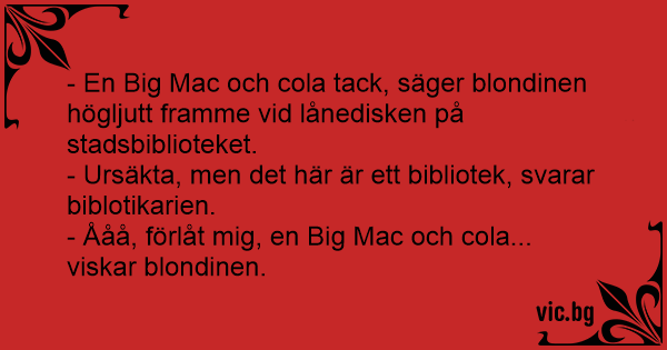 - En Big Mac och cola tack, säger blondinen högljutt framme vid lånedisken på stadsbiblioteket.