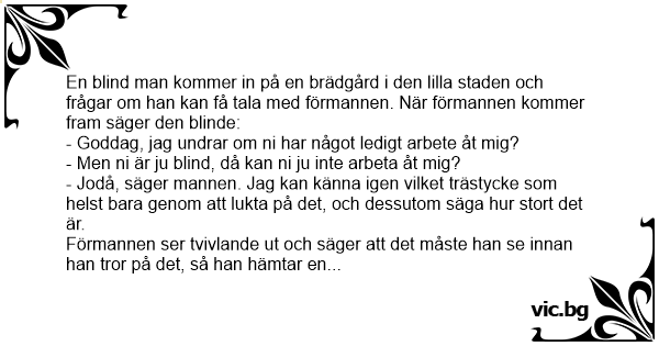 En blind man kommer in på en brädgård i den lilla staden och frågar om han kan få tala med förmannen. När förmannen kommer fram säger den blinde: