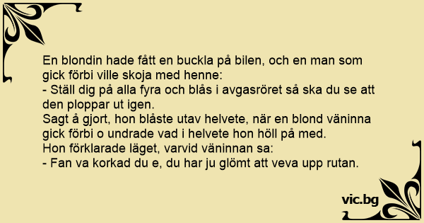 Det va en gång en blondin som hade fått en buckla i sin bil vilket hon var väldigt förtvivlad över. Det kom en äldre man gående förbi och blondinen frågade mannen om han visste vad hon skulle göra...