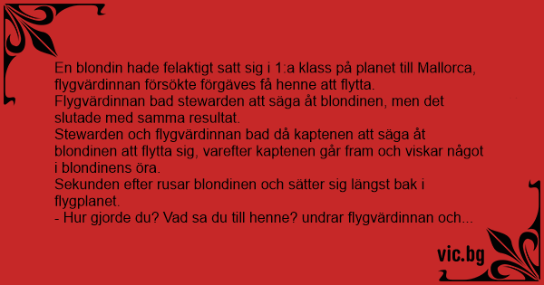 Flygvärdinnan på ett flygplan som skulle till New York gick fram till en blond kvinna som satt i första klass. Flygvärdinnan bad blondinen att flytta till ekonomiklassens avdelning, eftersom hon inte hade någon biljett för första klass. Blondinen...