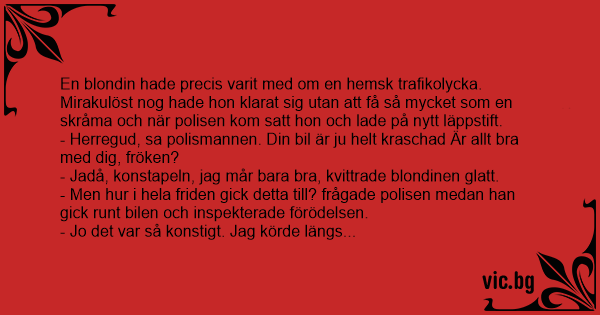 - Herregud, sa polismannen. Din bil är ju helt kraschad Är allt вrа med dig, fröken?