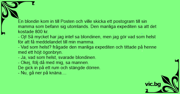 En blondin kom in till Posten och ville skicka ett postogram till sin mamma som befann sig utomlands. Den manliga expediten sa att det kostade 800 kr.