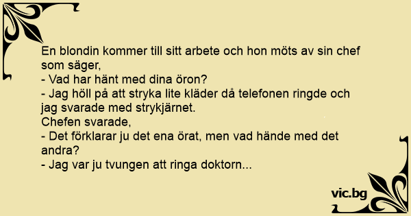 Две блондинки: - Муцка, защо са ти превързани и двете уши? - Оооф, вчера взех да гладя. Звъни ми телефона през това време... - И ти кво? - Вместо телефонът допрях ютията до ухото си... - Добре де,...