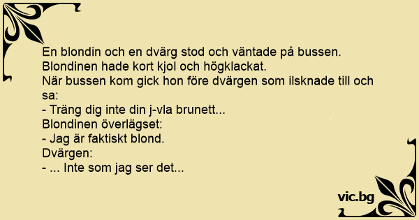En blondin och en dvärg stod och väntade på bussen. Blondinen hade kort kjol och högklackat.