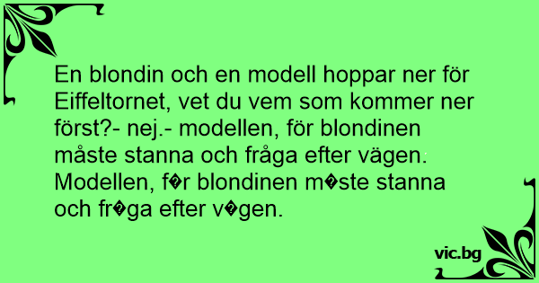 En blondin och en modell hoppar ner för Eiffeltornet, vet du vem som kommer ner först?- nej.- modellen, för blondinen måste stanna och fråga efter vägen.