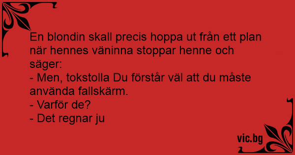 En blondin skall precis hoppa ut från ett plan när hennes väninna stoppar henne och säger: