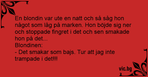 En blondin var ute en natt och så såg hon något som låg på marken. Hon böjde sig ner och stoppade fingret i det och sen smakade hon på det...
