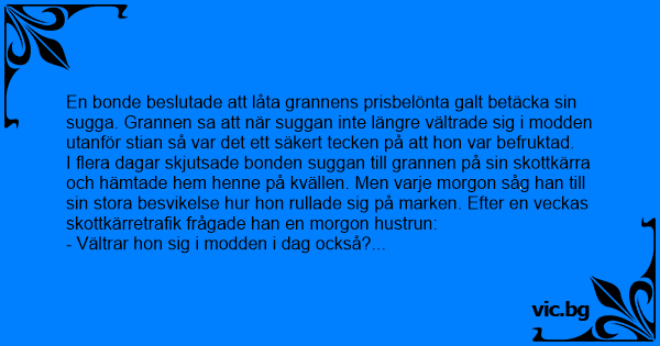 I flera dagar skjutsade bonden suggan till grannen på sin skottkärra och hämtade hem henne på kvällen. Men varje morgon såg han till sin stora besvikelse hur hon rullade sig på marken. Efter en veckas skottkärretrafik frågade han en morgon hustrun: