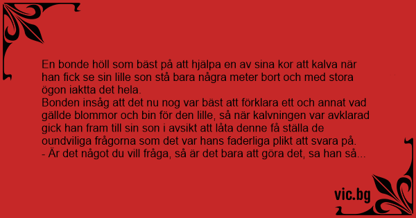 Bonden insåg att det nu nog var bäst att förklara ett och annat vad gällde blommor och bin för den lille, så när kalvningen var avklarad gick han fram till sin son i avsikt att låta denne få ställa de oundviliga frågorna som det var hans faderliga plikt att svara på.