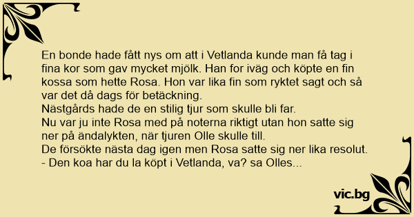 En bonde hade fått nys om att i Vetlanda kunde man få tag i fina kor som gav mycket mjölk. Han for iväg och köpte en fin kossa som hette Rosa. Hon var lika fin som ryktet sagt och så var det då dags för betäckning.